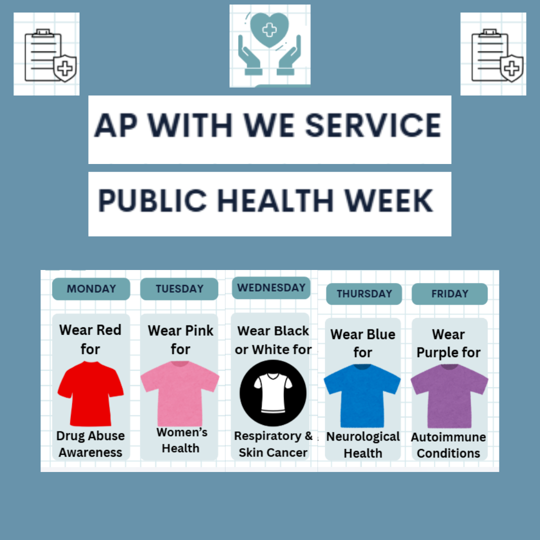 Greenbrier High School's AP with WE Service Public Health students are leading a Public Health Week March 16 through March 20! Please feel free to participate by wearing the color of the day to bring about awareness for various public health issues/conditions at school or in the community. Each day represents one or two of the students’ service projects. They have learned about public health and are engaging in public health service projects. Join us in a week of awareness. Stop by the booths at lunch to take a public and/or global health pledge.